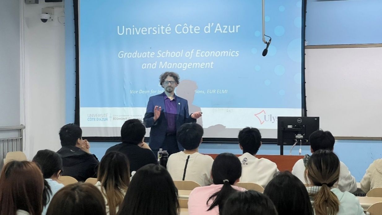 访问期间,勒库图副院长在学院领导的陪同下参观了教学设施、自习室和学生创业咖啡吧,对国际商学院的办学条件和国际化氛围给予高度评价。在专题座谈会上,勒库图副院长以蔚蓝海岸大学与ELMI欧洲大学研究院的国际战略:研究与创新方向为主题,详细介绍了蔚蓝海岸大学的国际化发展战略,重点阐述了其研究与创新核心方向如何回应全球合作伙伴国家的社会与地域挑战。他指出,蔚蓝海岸大学依托法国卓越大学计划IDEX)的科研优势,通过跨学科合作推动人工智能、可持续发展、海洋经济等前沿领域的创新研究,并与国际伙伴共同应对气候变化、数字化转型等全球性议题
