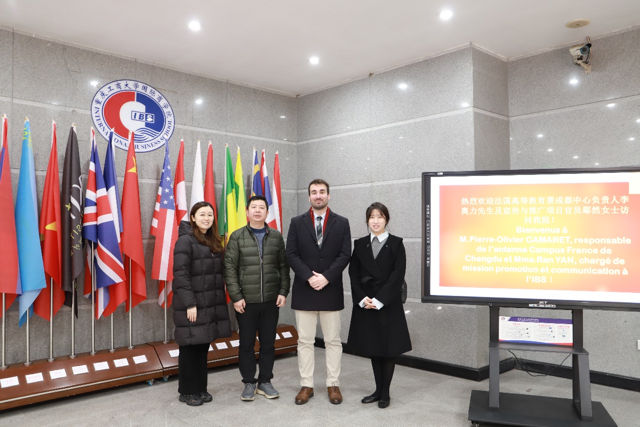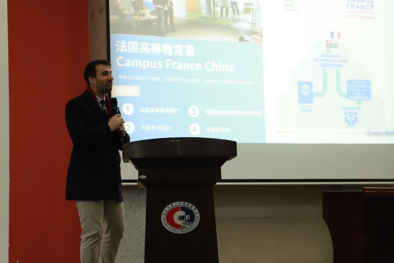 为精准助力中法项目同学规划留法深造路径、搭建权威高效的留学信息沟通桥梁,2025 年 12 月 23 日 13:00,我院于 407 多功能厅成功举办法国高教署留学宣讲会。会前,我院院长詹川、国际部法语部部长张蓝月与特邀主讲嘉宾 —— 法国高教署成都中心负责人李奥力先生、留学指导项目官员鄢然女士,围绕中法合作项目推进及法国高校资源对接等事宜展开深入交流。宣讲会期间,我院中法项目全体同学参会,现场互动踊跃,交流氛围热烈。