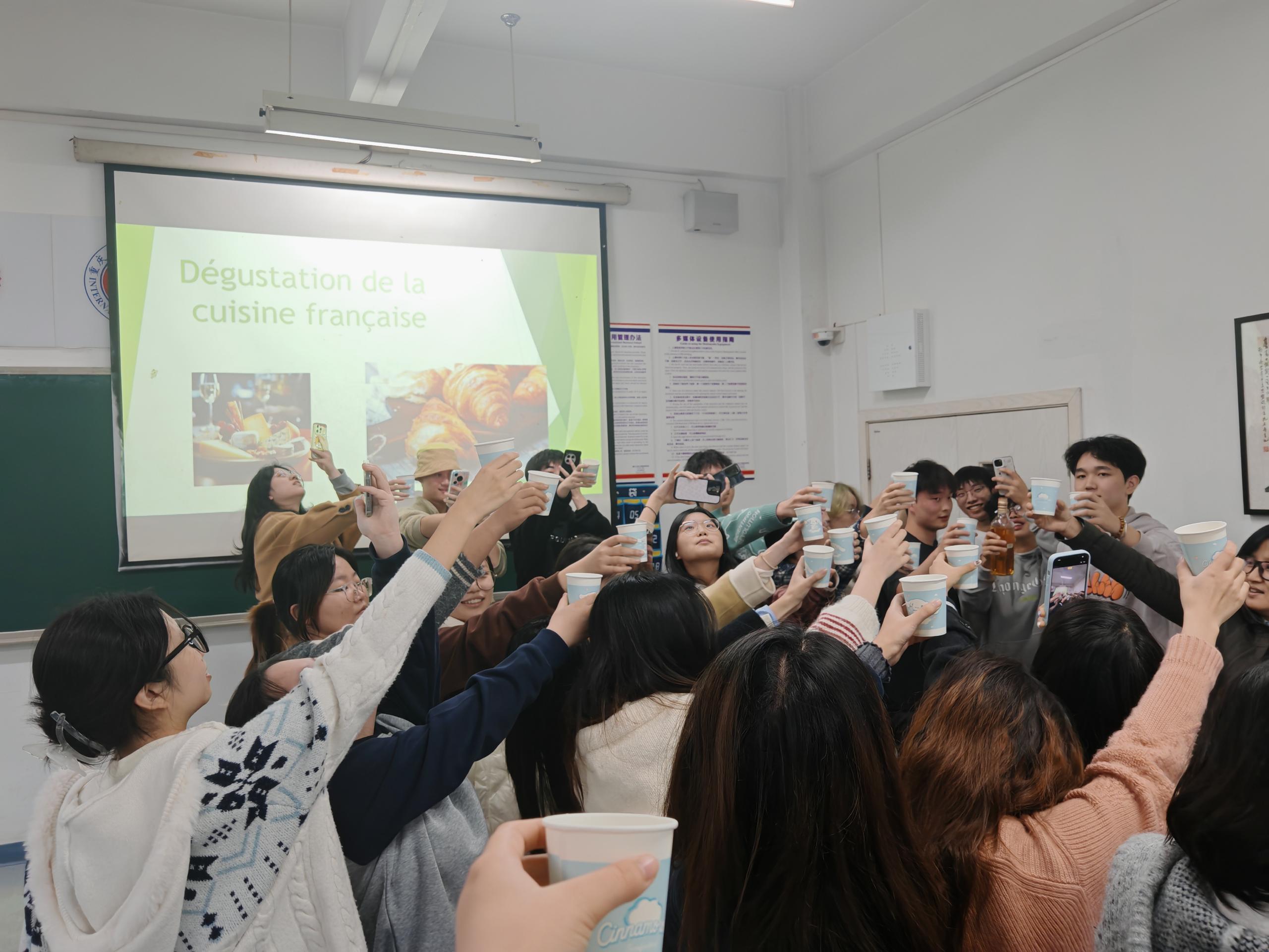 活动现场布置充满法式风情,投影屏幕上“Dégustation de la cuisine française”(法国美食鉴赏)的主题字样格外醒目。课堂上,师生们围绕着摆满法式美食的桌台,共同开启了一场味蕾与文化的双重探索之旅。