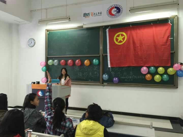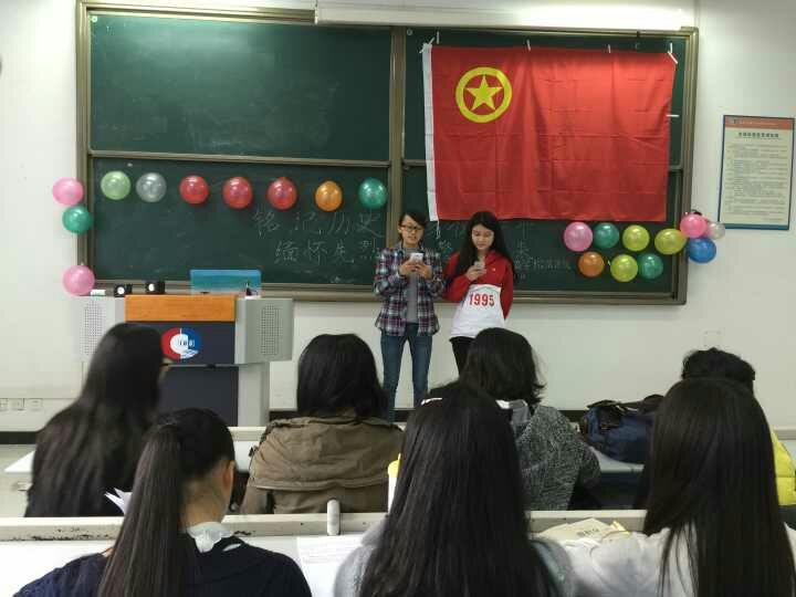 2015年11月6日晚上18:30,在学院分团委的指导下,我院15级法语班团支部于60405教室成功举办了主题为“回顾历史,缅怀先烈”的团日活动。此次活动由团支书何雪梅同学担任主持人。