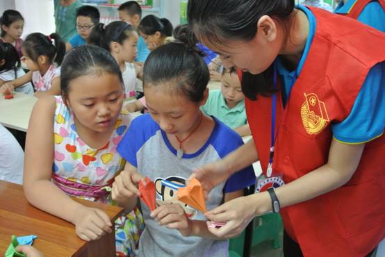 与此同时,在云泽路社区社会实践服务团主要授课人赵月通过PPT与视频结合的方式为社区小朋友讲解青蛙的折法,整个课堂气氛活跃有序,让社区小朋友们体会到了折纸的乐趣。