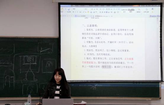 培训活动前同学们有序签到,签到完毕后便由学生会编辑部部长银心怡同学对培训活动做了简单地介绍。培训活动分为两部分,一部分是新闻摄影培训,另一部分是新闻稿件培训。首先,新闻中心鞠丛阳同学为同学们普及了关于摄影的基础知识。鞠丛阳同学不仅传授自身经验,在黑板上画图讲解,还自称“灵魂画手”引得同学们哈哈大笑,给同学们的培训增添了不少乐趣。在鞠从阳同学介绍完会议照片与活动照片的不同后,摄影培训告一段落。紧接着就是学生会编辑部部长银心怡负责的稿件培训,在精心的准备后给同学们带来的是一份完美的“报告”。银心怡同学从稿件的内容格式入手详细地讲述了一份稿件的产生,让同学们对稿件有了进一步的了解。很快,时间过去,培训结束,同学们有序离开教室。
