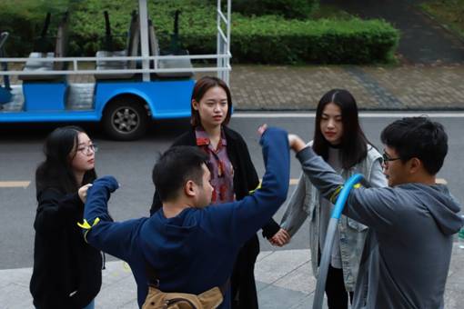 本次活动分为国商教学楼里和工商校园内两部分,大部分在户外进行,压轴游戏在国商举行。在活动前就已被提前随机分好组的参与人员需戴上不同颜色的丝带整装出发,并根据在现场抽到的路线图依次有序进行室外活动项目。每个小组共有6个活动项目,尽管每个项目难度适中,但还是需要小组成员团结一致,遍处可见成员们的欢呼声,构成了学生会里那一抹最炫的风景。