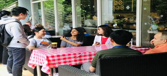 图为:留学生和我校学子在咖啡吧