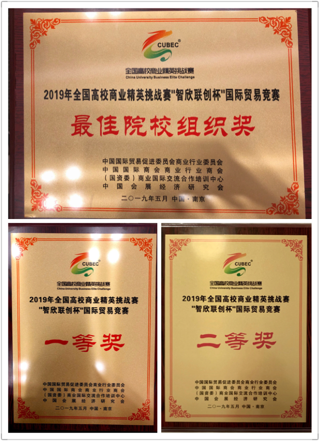 2019年6月1日—6月3日由中国国际贸易促进委员会商业行业委员会、中国国际商会商业行业商会、商业国际交流合作培训中心和中国会展经济研究会联合举办的“2019年第九届全国高校商业精英挑战赛国际贸易竞赛”在南京国际展览中心举行,以我校经济学院蒋兴红老师带领的国际商学院两支代表队在此次比赛中取得优异成绩。