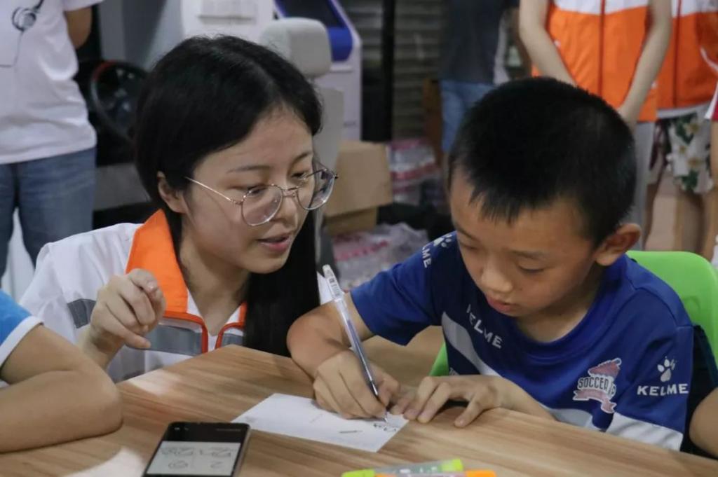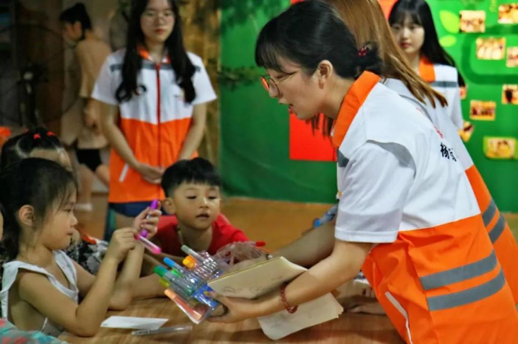 图为:志愿者耐心指导小朋友作画