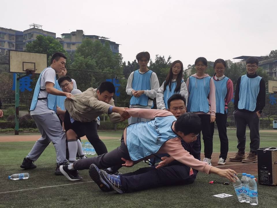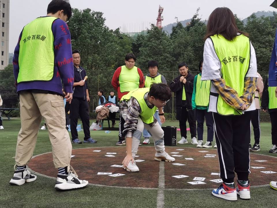 接下来又进行了“听指令迈步”和“划拳接龙”两个环节,锻炼了同学们思维的逆向性和敏捷性。随后,进行了三轮“摸牌”,大家齐心协力向前,冷静处理,高度配合。经过教练悉心指导,两队的成绩均有了大幅度提高,并总结出要把大目标分解成一个个小目标等经验,该项目为同学们提供了时间管理的方法并且提高了同学们的团队协作意识。 “雷区取水”的环节则增加了学生之间彼此的信任程度。