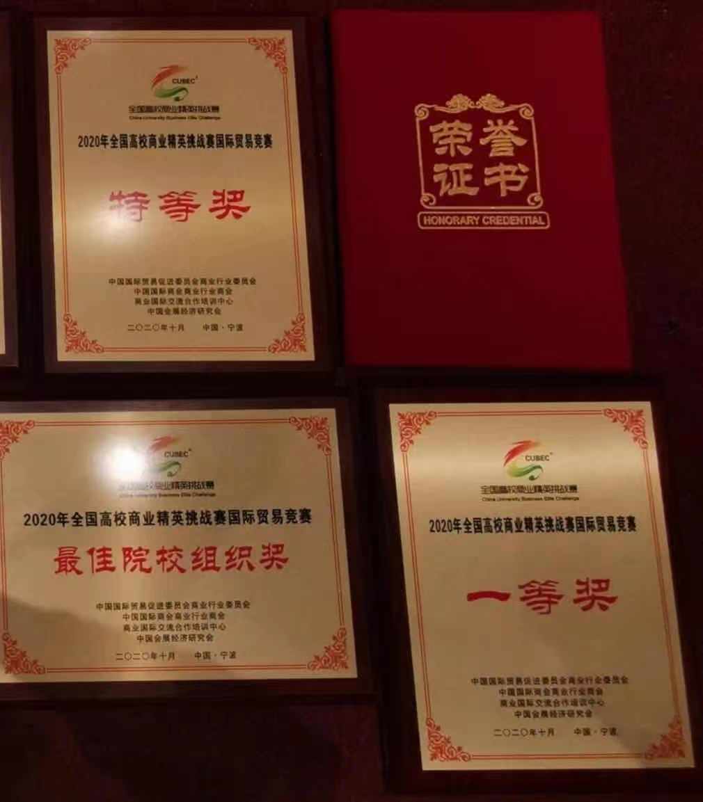 2020年全国高校商业精英挑战赛以2020年中国(宁波)跨国采购商品洽谈会暨2020年中国(宁波)品牌商品博览会在宁波举行。此赛事共有来自北京、福建、甘肃、河北、湖南、江苏、山西、陕西、上海、四川、江西、浙江、重庆等20个省、自治区和直辖市的75所高等院校130支参赛队,超过1000名参赛选手和辅导教师参赛。我院2支参赛队伍获得特等奖一项(全国共7支队伍获得),一等奖一项。我院也获得最佳院校组织奖。