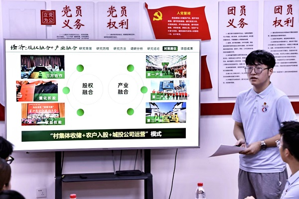 国际商学院暑期“三下乡”实践团队负责人朱磊分享学院暑期实践团队概况,同时由该学院学生骨干钟瑞景进行了团学工作交流。她分享道,该学院学生工作以立德树人为根本任务、三全育人为工作导向、五育并举为明确指引、全球胜任力为培育模型,致力构建九大团学体系,助推学院团学工作不断开拓创新、持续稳健发展。