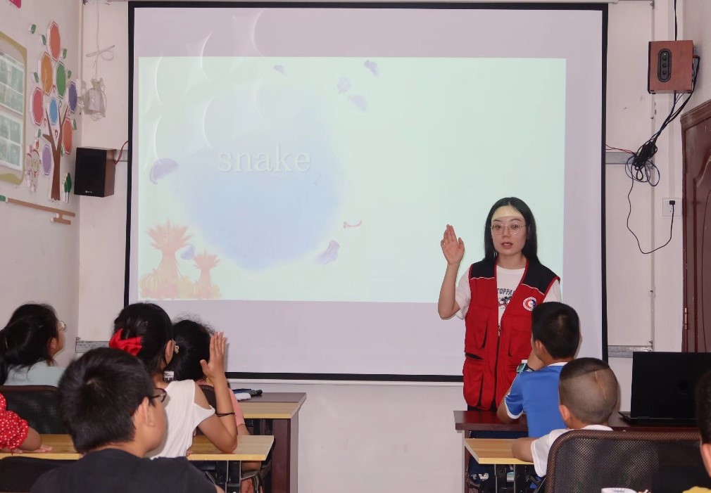在课堂中,志愿者首先通过分组比拼、创设情境、小组讨论等方式激发起同学们学习英语的兴趣。在对单词进行基本的学习后,志愿者通过与同学们做英语的“你说我猜”、“击鼓传花”等小游戏,提高课堂趣味性的同时,进一步加深了同学们对英语单词的记忆。为了使同学们对所学单词能更好地理解和运用,志愿者在最后以情景剧和英文歌曲等有趣的形式结束本次趣味英语课程。课堂结束后,许多学生向志愿者积极发表自己对英语的看法并提出在课堂中产生的困惑。