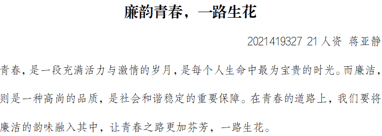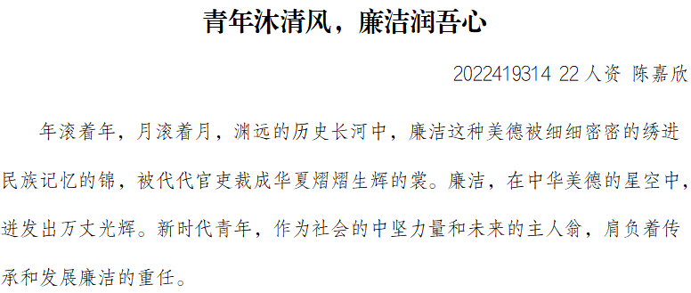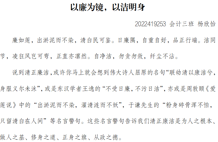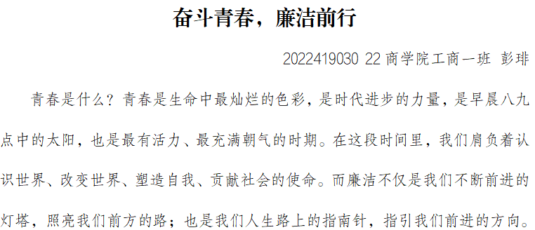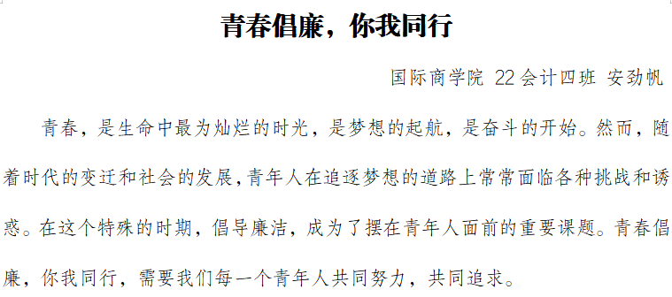 此次征文活动一经推出,便得到了我院学生的热烈响应与积极参与。他们以中国新一代青年学子的视角,深入挖掘“青春倡廉,一路同行”的丰富内涵,用文字描绘出一幅幅动人的廉洁画卷。同学们结合自身实际,从学习、生活、工作等多个维度出发,生动讲述了自己与廉洁自律的点滴故事,展现了青年学生崇尚廉洁、拒绝腐败的良好精神风貌。