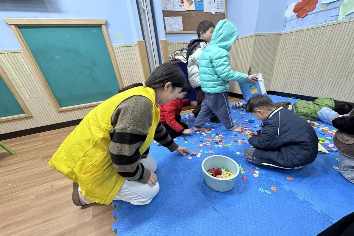 在启智板块,志愿者们打造了“拼图课堂”,他们选取以《彩虹色的花》为主题的情感拼图,通过“色彩分类-图形拼接-情景再现”三阶递进模式,引导自闭症孩子们建立物品秩序感,进而实现触觉训练、视觉联动、协作表达的服务效果。