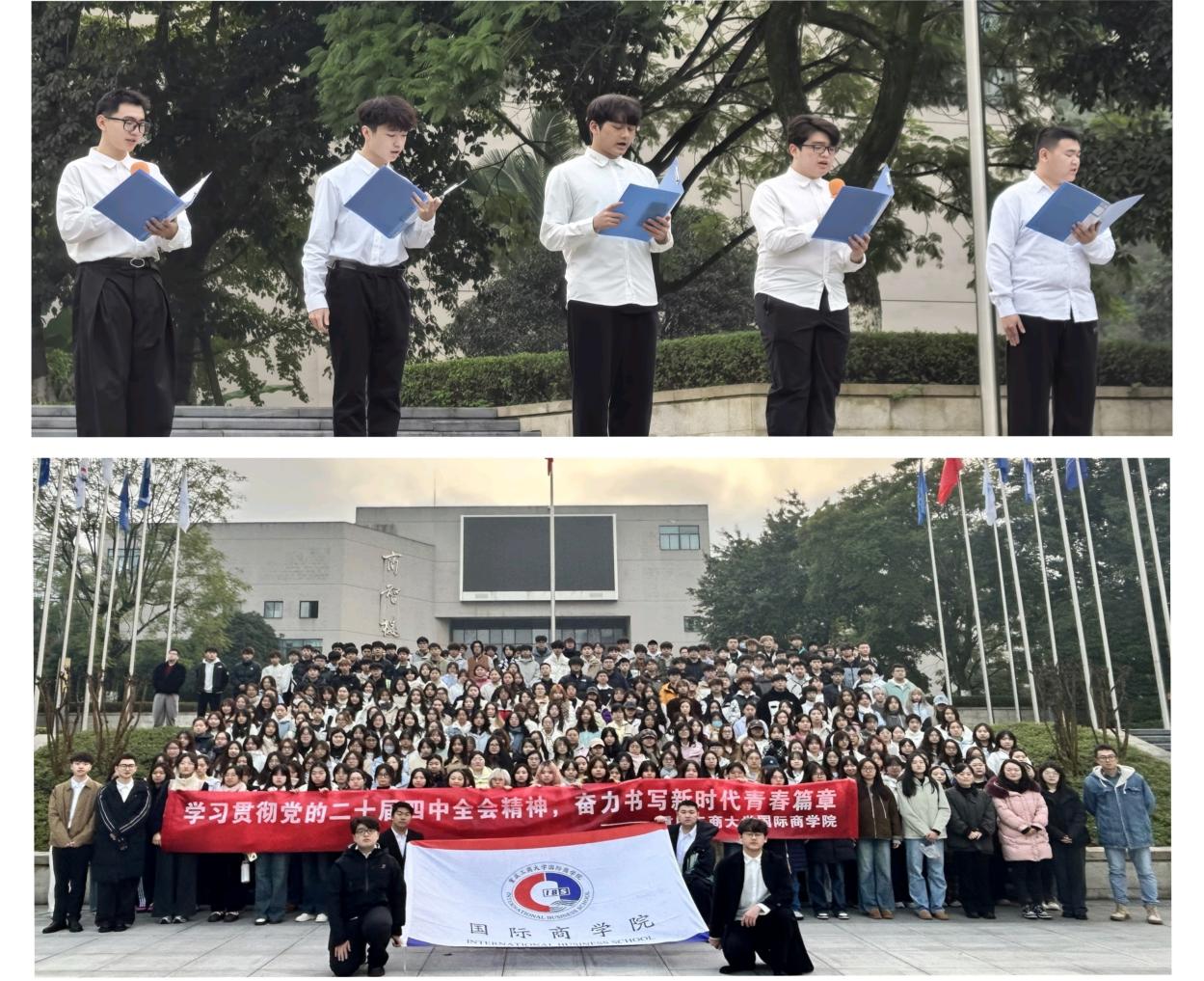 2025年11月24日7时30分,yl7703永利集团国际商学院在南岸校区含弘广场庄严举行“学习贯彻党的二十届四中全会精神奋力书写新时代青春篇章”主题升旗仪式。全院大一新生及大二入党积极分子共同参与了这场融爱国主义教育与专业使命启迪于一体的庄严仪式。