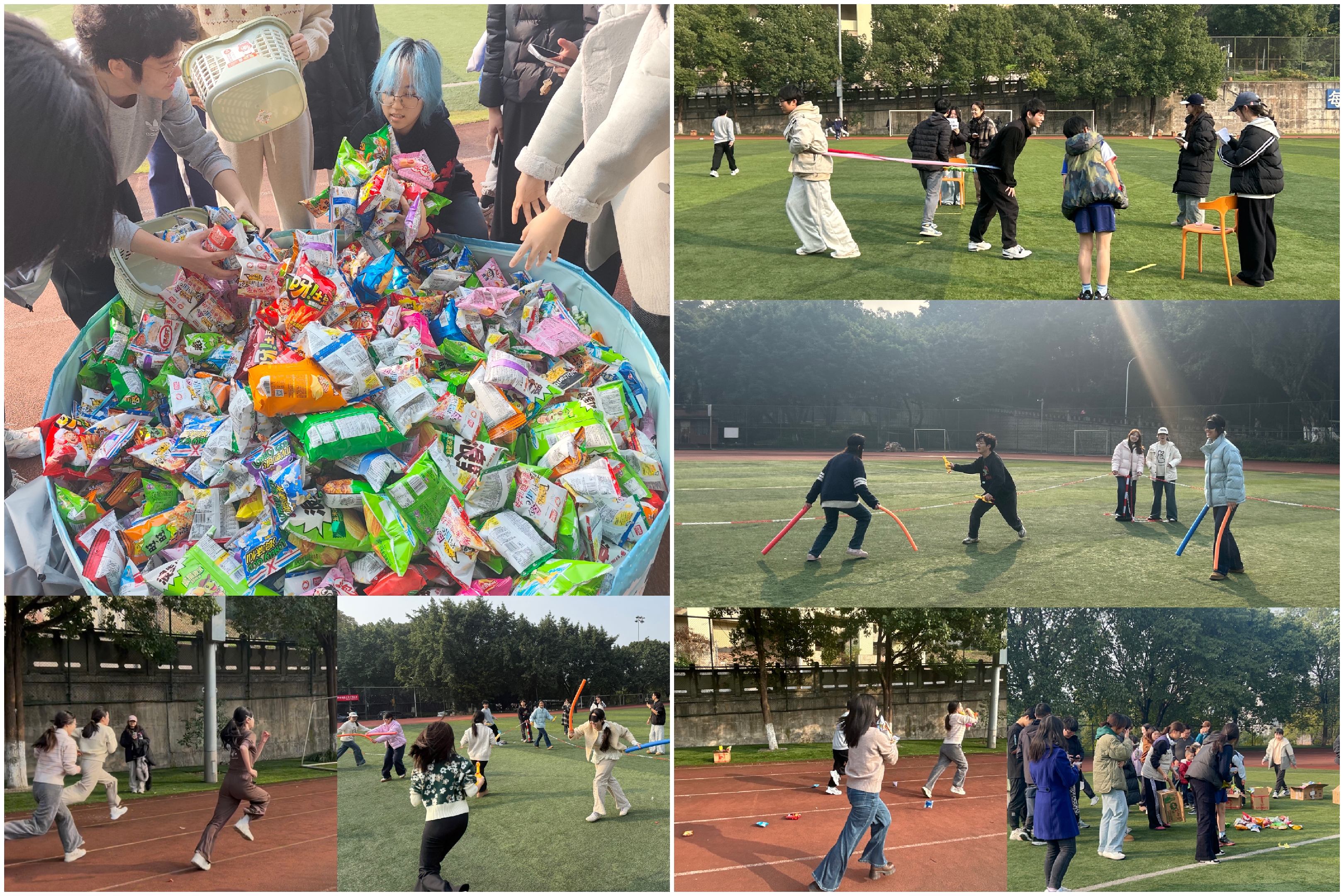 活动精心打造“天旋地转觅食记”“零食速运大作战”“盲打侠”“方向风暴”四大特色环节,以“运动竞技+零食夺宝”为核心亮点,将平衡掌控、速度比拼、声感辨识与脑力博弈巧妙融入趣味挑战。其中,“天旋地转觅食记”“零食速运大作战”聚焦零食争夺,参与者在欢乐角逐中轻松斩获“战利品”,怀抱满满零食凯旋的模样,成为现场最具感染力的风景;另外两大环节凭借创意互动点燃全场热情,充分展现师生昂扬向上、奋勇争先的青春风采,赛场之上欢呼声与笑语声交织,尽显校园蓬勃生机。