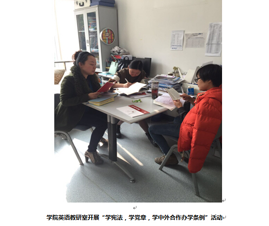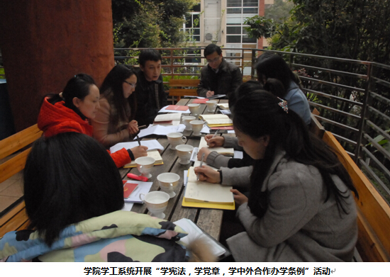 本学期开学以来,学院党政领导和教职员工集中学习讨论“《宪法》、党章、《中外合作办学条例》”,学生党支部和团支部也开展了类似的学习活动。学院党总支在认真学习和研究之后,就新时期加强和改进大学生思想政治工作达成共识,一致认为,党建工作首先是思想建设,要旗帜鲜明地加强意识形态教育;在中外合作办学条件下,文化冲突的核心和实质是价值观的冲突,要坚持培育和弘扬社会主义核心价值观,提高师生辨别能力,正确对待、处理中西文化冲突、优秀传统文化的继承等问题;要培育师生的法治思维,养成法治意识,包括规则意识、权义意识、程序意识和修复意识等。