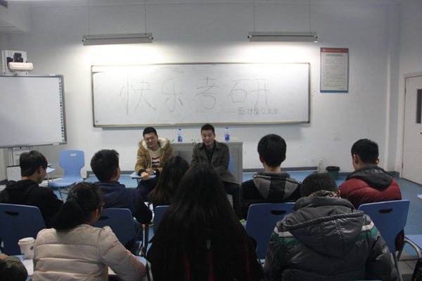 活动开始,王海和王庆龙同学首先对近年来各大高校的考研情况进行了大致描述。随后,他们结合自身经历向同学们提出有关考研、学习的许多建议,如:英语学习的重要性以及微积分的学习方法等。紧接着,同学们纷纷地提出了有关自己当下学习和将来考研的问题,王海和王庆龙同学都一一耐心解答。活动过程中,同学们都积极踊跃地发言、提问,沉浸于此次学习交流活动中。最后,在和谐的气氛中,此次活动顺利结束,同学们都获益匪浅。