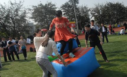 当天下午13:30分,我院参赛教职工齐集北区足球场参加开幕式,校工会陈晓东主席致开幕词并宣布开幕。我院40余名教职工共分成7个小组,分别参加了“欢乐龙舟”、“龟兔赛跑”、“财源滚滚”、“超级障碍”、“运转乾坤”、“人桥接力”、“快乐大脚”等比赛项目。老师们兴致勃勃,热情高涨,发扬团结协作精神,比赛气氛热烈,意趣盎然。