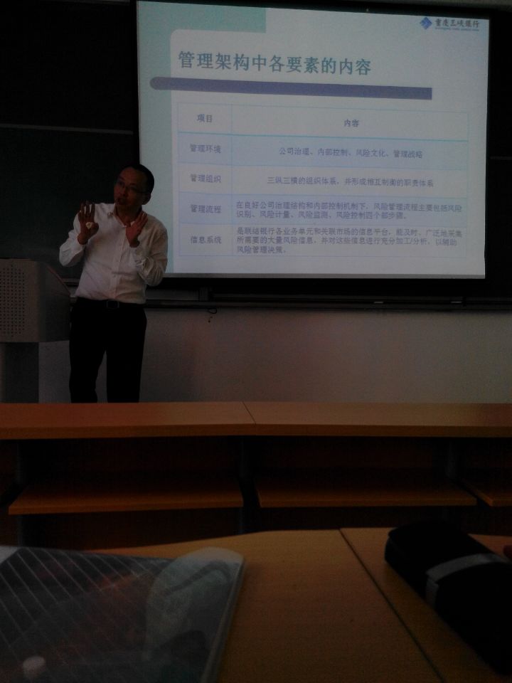 汪先俊先生向同学们主要介绍了信用及诚实信用原则的应用,银行风险管理基本架构和关于银行风险类型、部门的专业知识。汪先俊先生说,有效的风险管理是一个组织成熟、有责任感的表现;相对于个人,识别并规避风险是独立能力的体现;相对于整个社会而言,重视风险管理控制,就是重视信用,这是文明进步的趋势。