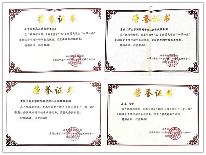 2016全国大学生“一带一路”暑期社会专项行动中国际商学院社会实践服务团所获荣誉证书