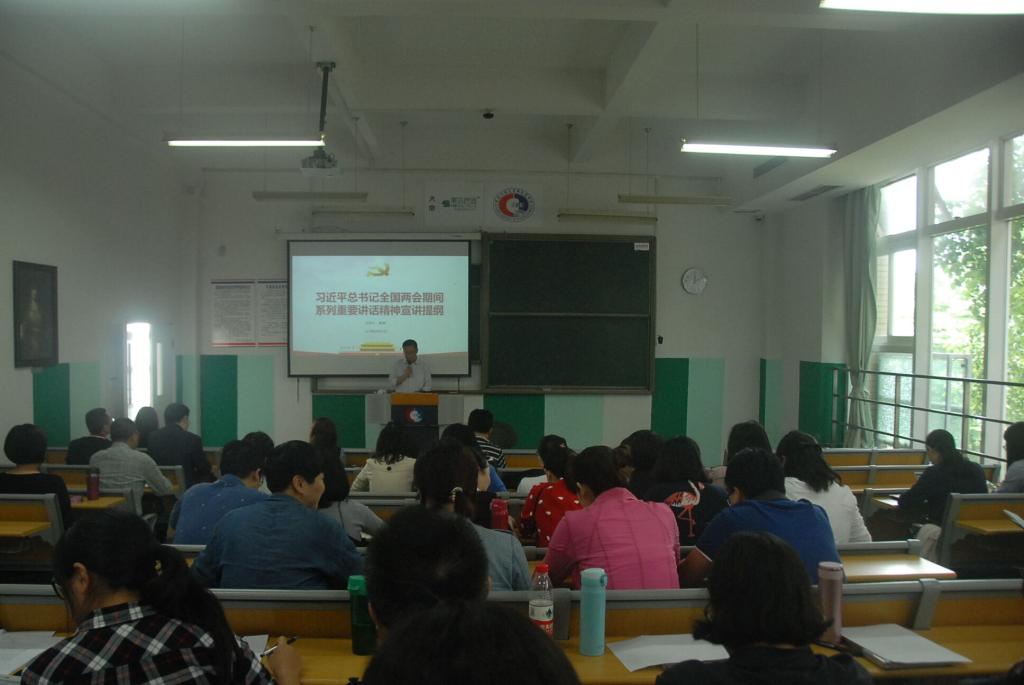2018年4月27日下午,学院党总支在60406教室举行全体教职工政治学习活动。本次政治学习的主题为2018年全国两会精神和习近平总书记全国两会期间系列重要讲话精神宣讲。主讲人为学院党总支书记兼院长赵驹教授。学院全体教职工参加了本次政治学习。
