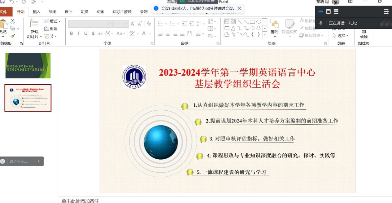 2023年1月8日,国际商学院英语语言中心召开了2024年第一次教学组织生活会,会议围绕“新一轮教育部审核评估”“项目班雅思考试情况”和“2024年工作展望”三项议题开展。