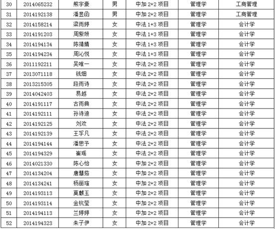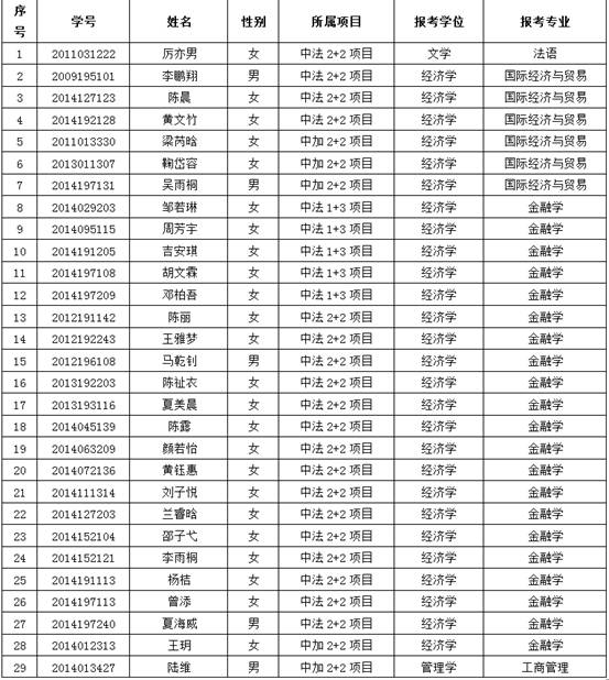 国际商学院中外双学士项目2017年回国取位考试报名名单