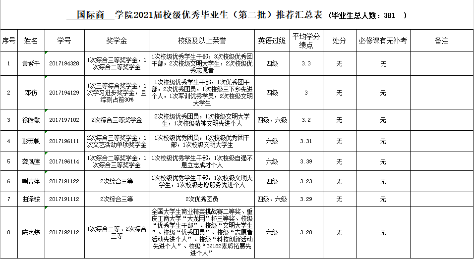 根据《yl7703永利集团优秀毕业生评选办法》的规定,决定开展我校2021届大学优秀毕业生(第二批)的评选工作。现将国际商学院2021届优秀毕业生评定结果公示如下: