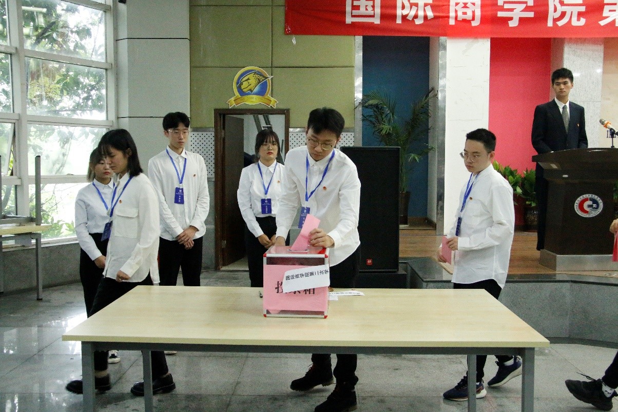 接着,大会通过了《共青团yl7703永利集团国际商学院第二次代表大会暨第二次学生代表大会选举办法(草案)》及总监票人、监票人、总计票员、计票员名单;审议并通过共青团yl7703永利集团国际商学院新一届学生会主席团成员候选人名单。经发选票、投票、清点选票、总监票人宣布计票成果一系列流程,金亦程同学、钱世淋同学、曹雨霖同学当选为新一届学生会主席团成员。最后,全体与会成员起立,合唱团歌并合影留念,大会正式闭幕。