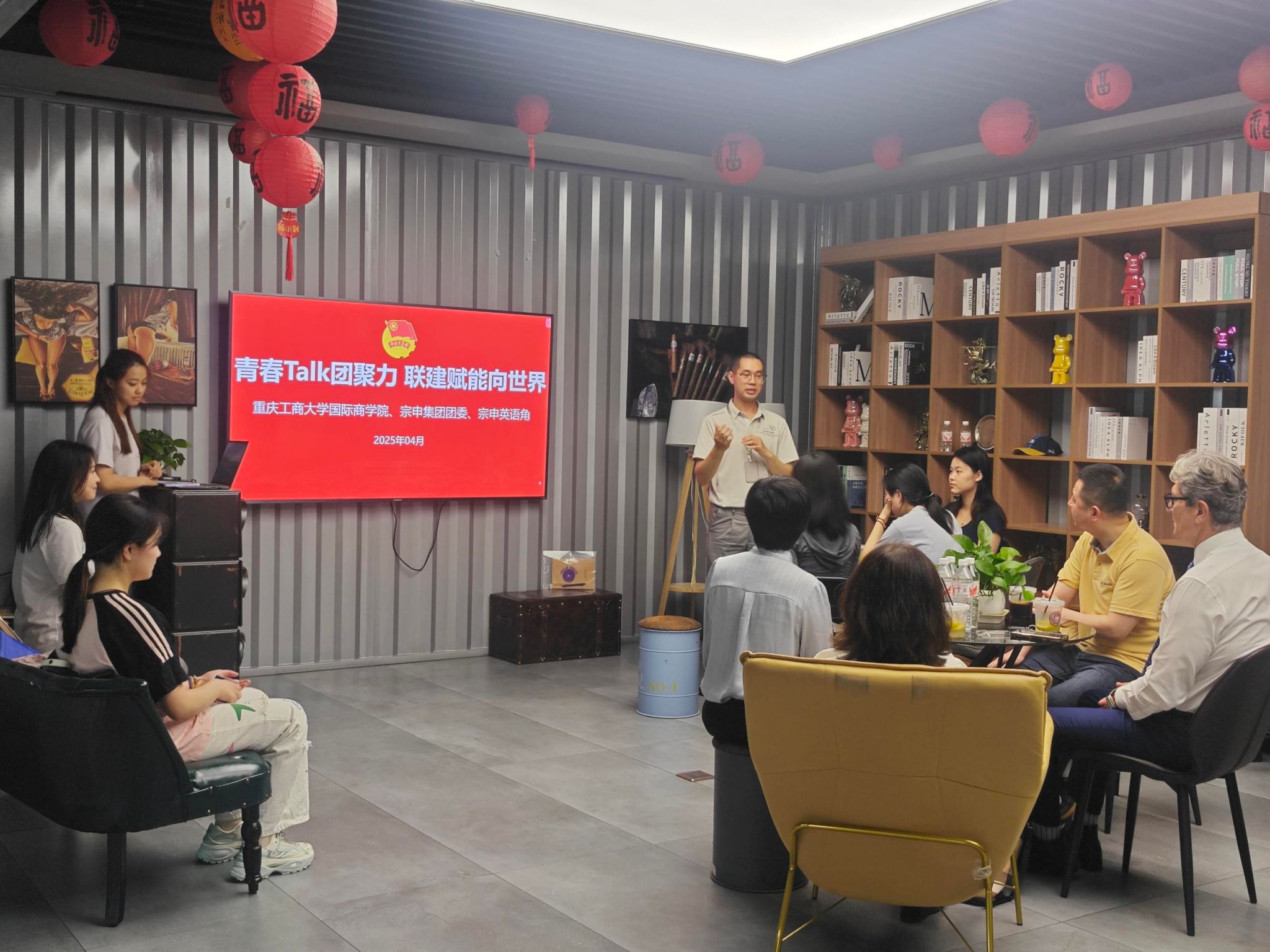 参观完后,师生们前往宗申集团“青年之家”英语角专题交流会上,双方围绕“全球化背景下中国智造的机遇与挑战”主题展开研讨。宗申集团团委代表以企业国际化战略为切入点,系统阐述技术革新对全球产业链重构的深远影响;管理学部系主任代俊结合宗申集团海外市场拓展案例,剖析中国智造企业在技术输出、品牌国际化进程中面临的跨文化沟通挑战,引导学生深化理解国际化案例;专任教师靳丽遥全程指导同学们开展英文交流,以全球视野分析热门议题,通过案例推演等形式,强化学生跨语言表达与国际规则应用能力。同学们则结合国际贸易等学科视角,从理论层面对产业实践进行多维解析。互动答疑中,学生针对职业定位、技能提升、实习机会等提问,企业代表结合行业发展与学生背景给予个性化建议。