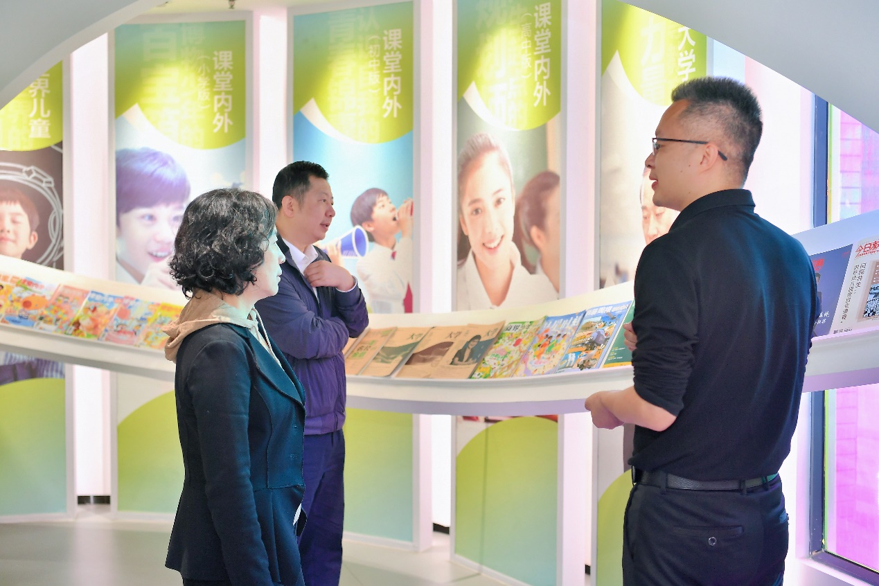 抵达《课堂内外》后,在企业负责人的陪同下,柏校长一行参观了公司的展厅。通过实地参观,学校领导直观地了解了《课堂内外》的企业文化、发展历程、业务范围。《课堂内外》作为国内知名的青少年传媒品牌,多年来一直致力于为青少年提供优质的阅读内容和教育资源,在期刊出版、新媒体运营、教育培训等方面取得了显著成绩,其创新的发展模式和丰富的行业经验给领导留下了深刻印象。
