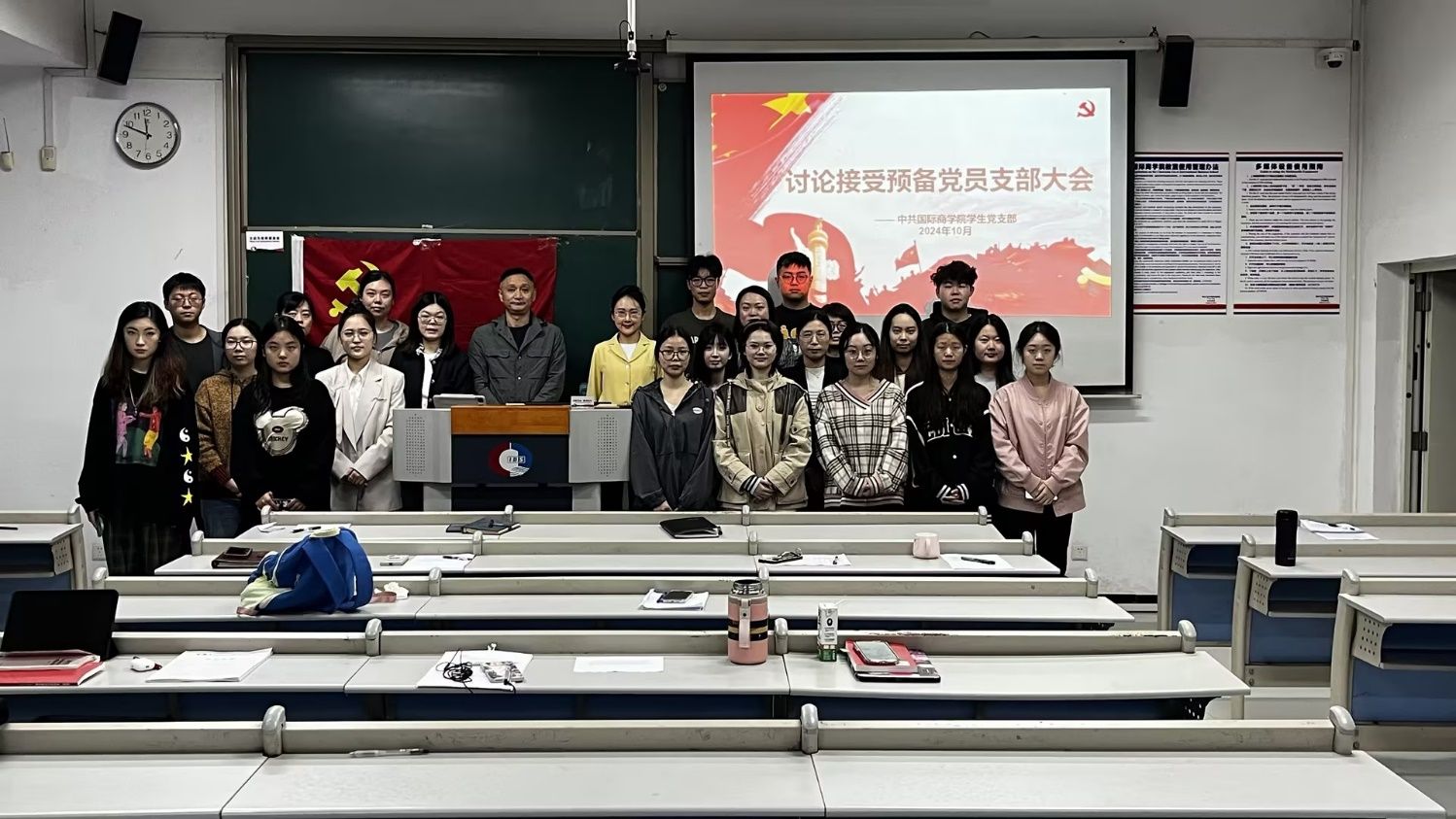 yl7703永利集团国际商学院学生党支部于2024年11月1日星期五上午10:00开展关于要胜蕾、叶楠锟、周春髯、田悦、王紫怡同志的党员发展会议。参与本次会议的有学院副书记胡婧婷老师,组织员朱富生老师,学生党支部书记彭丹老师,以及江洋老师、张静老师、熊敏老师、王娟老师、田莎老师、冯诗淇老师、江燕老师以及在校11名预备党员。