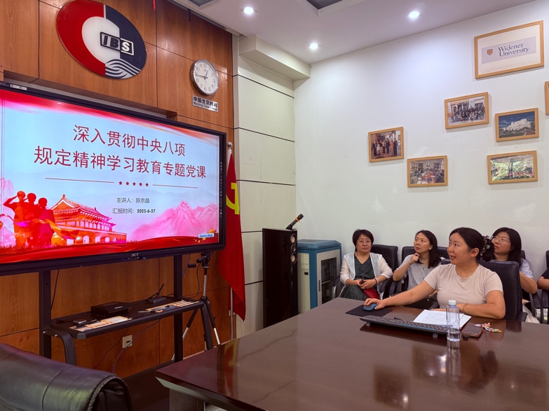 首先,学院教工党支部书记陈京晶为支部党员讲授了“深入贯彻中央八项规定精神学习教育”专题党课。陈书记结合典型案例与工作实际,系统解读了中央八项规定精神的核心要义、历史意义及实践要求,强调全体党员要始终保持清醒认识,严守纪律红线。她指出,落实中央八项规定精神是加强作风建设的关键抓手,各位党员须以身作则,将廉洁自律融入日常教学、科研和管理工作中。